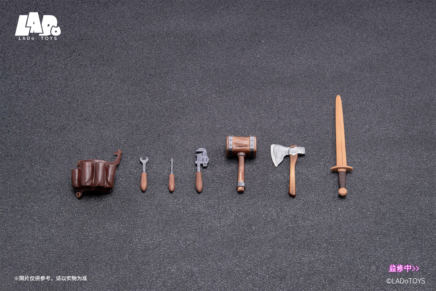 フィギュア本体 x 1 付け替え用フェイスパーツ x 3( 笑顔 · 照れる顔 · 怒る顔 ) け替えハンドパーツ x 8( 握り手 (1 セット) · ホールド (1 セット) · リラックスした手 · 開き手 · 腰を支える手 · スクリュードライバ手 ) 用具/武器 x 7( プライヤー · ドライバー · レンチ · 斧 · 木槌 · 木剣 · 工具収納袋 ) その他 x 2( アクションベース · 視線替え用ミニツール)